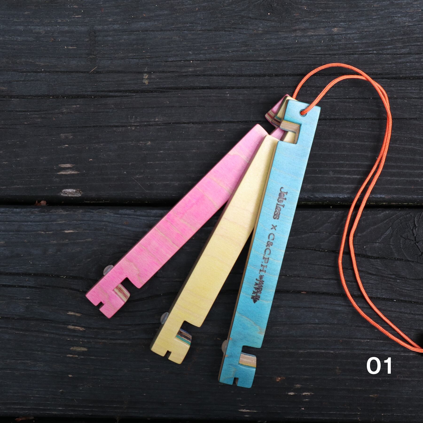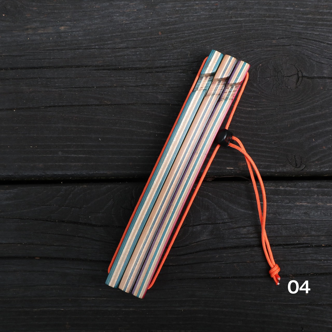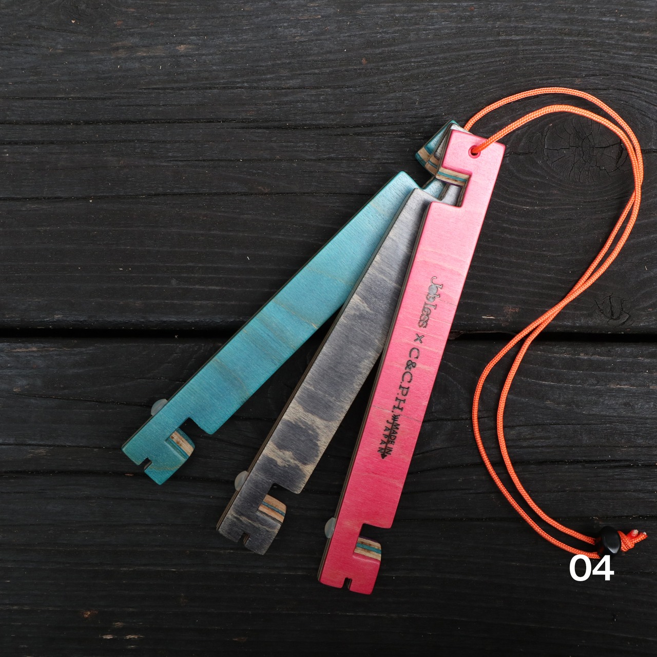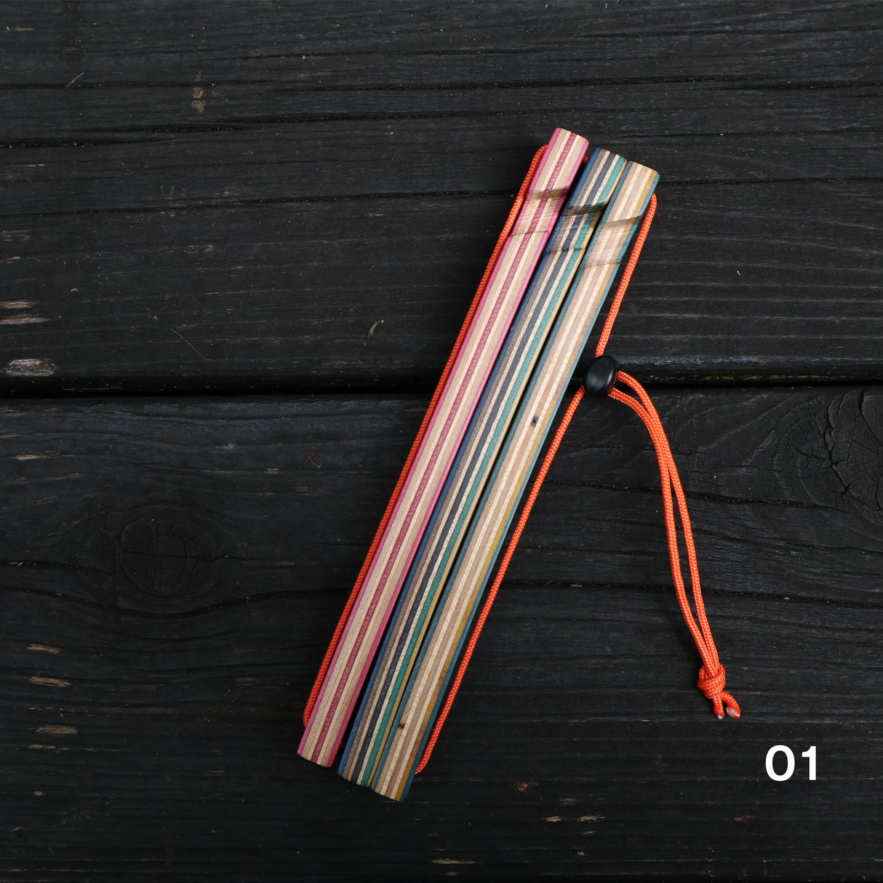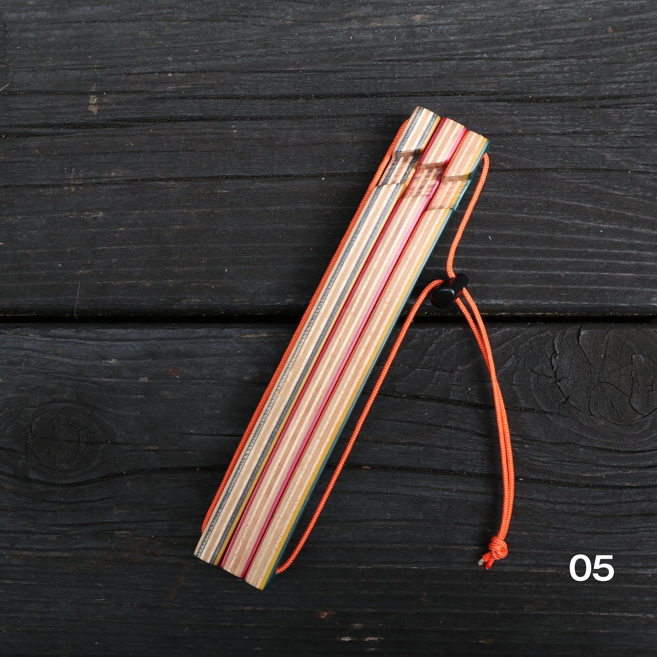 スケボー素材のマルチな色合いと、オレンジ色のパラコードでアウトドアライフを楽しく彩ります。