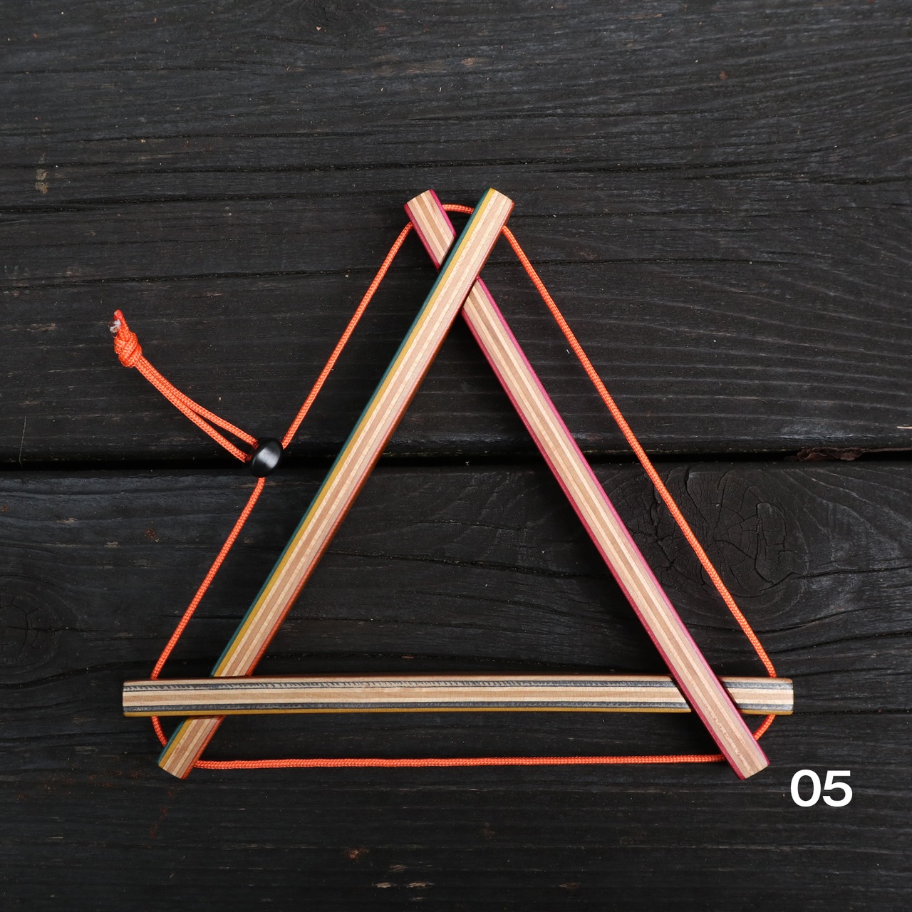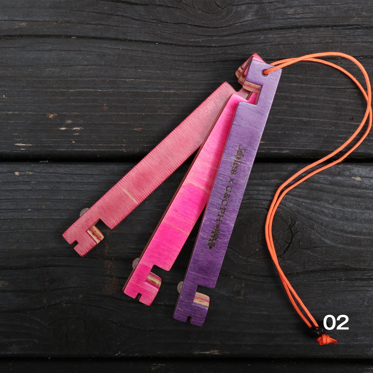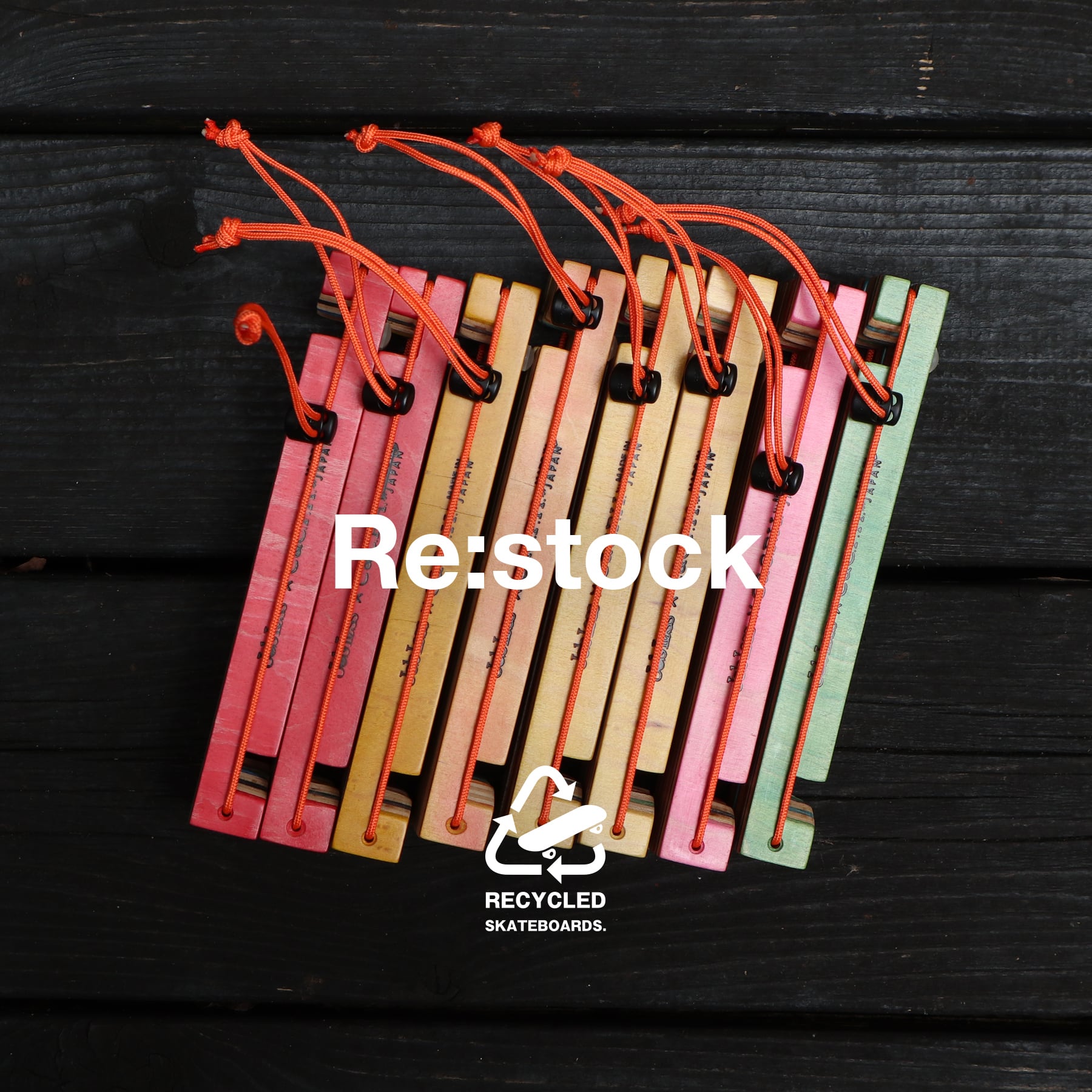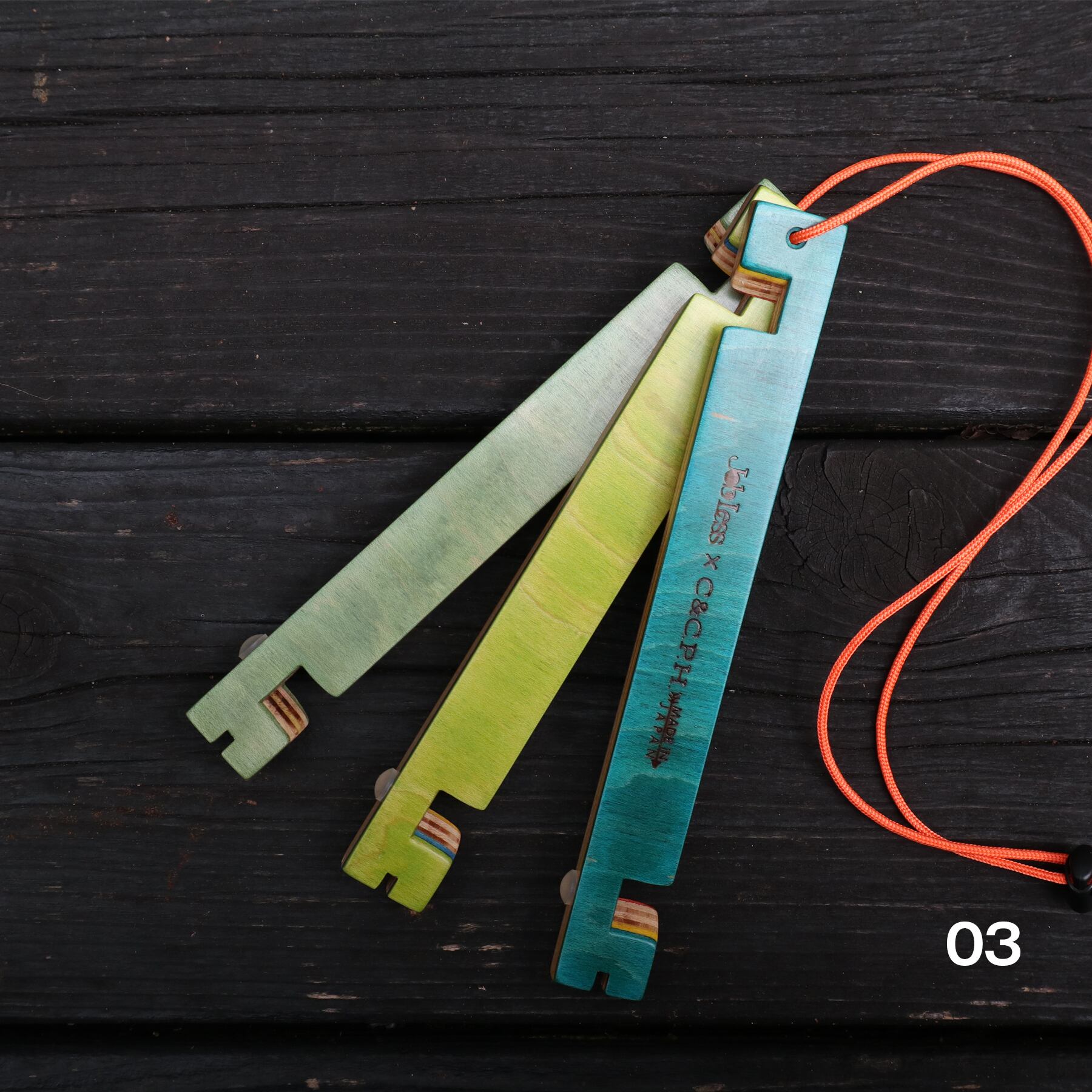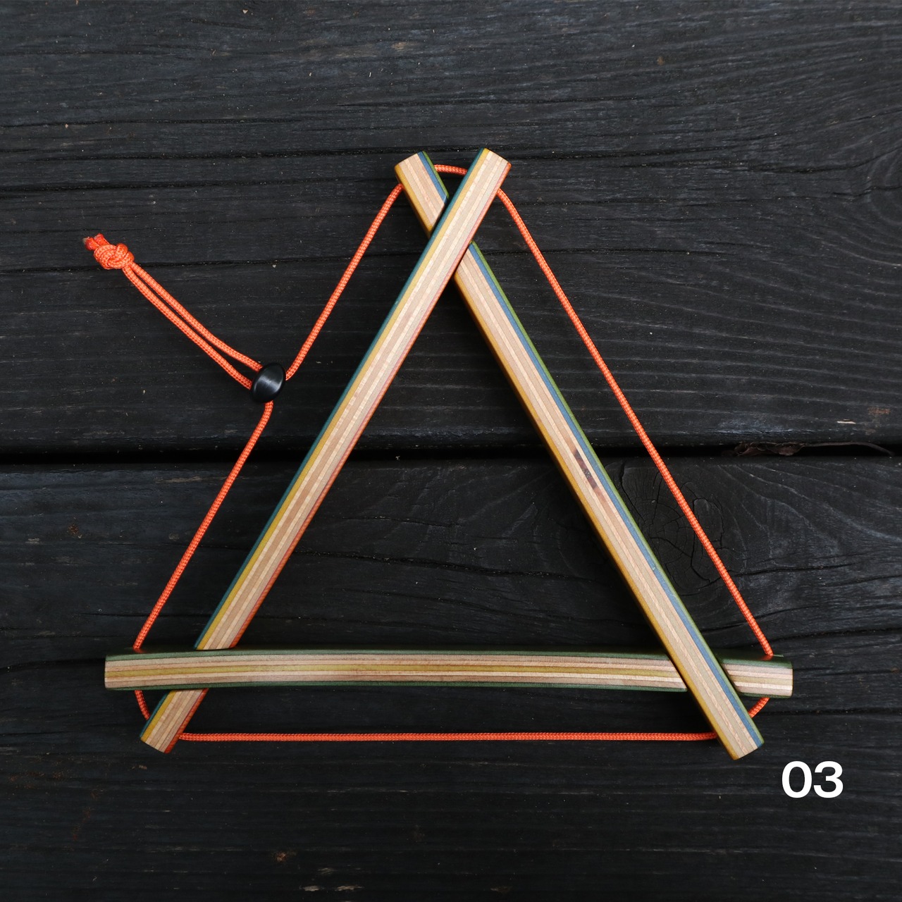 スケボー素材のマルチな色合いと、オレンジ色のパラコードでアウトドアライフを楽しく彩ります。